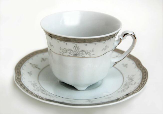 Piękna, srebrzona filiżanka do kawy ze spodkiem, E361 BOLERO, Polskie Fabryki Porcelany Ćmielów i Chodzież S.A. Biała ...