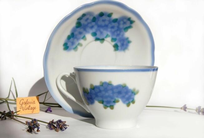 Piękna, unikatowa filiżanka ze spodkiem z subtelnym, ręcznie malowanym motywem błękitnych niezapominajek. Stara ...