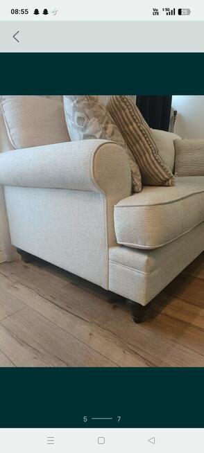 Wygodna, używana kanapa w neutralnym, jasnym kolorze. Posiada ozdobne poduszki, które dodają jej charakteru. Mebel jest w ...