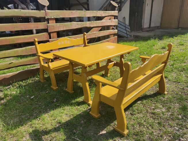 Musztardowy, drewniany zestaw ogrodowy składający się ze stołu i dwóch krzeseł. Meble są używane, ale w dobrym ...