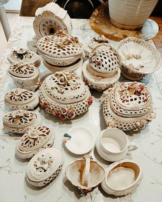 Komplet z porcelany 18 szt: Elementy są różnej wielkości i wysokości, wykonane wzorem ażurowym oraz maja dodatkowe ...