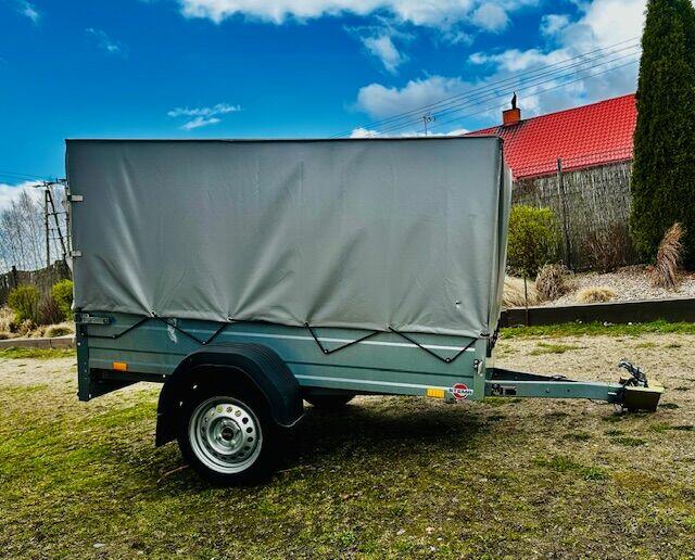 Przyczepka jednoosiowa firmy Stema z plandeka Masa własna: 240 kg Maksymalna waga ładunku: 508 kg Masa ...