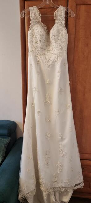 Witam. Sprzedam suknię ślubną widoczną na zdjęciu. Raz założona, kolor Ecru, rozmiar M. 40/42. Przywieziona ze Szkocji.