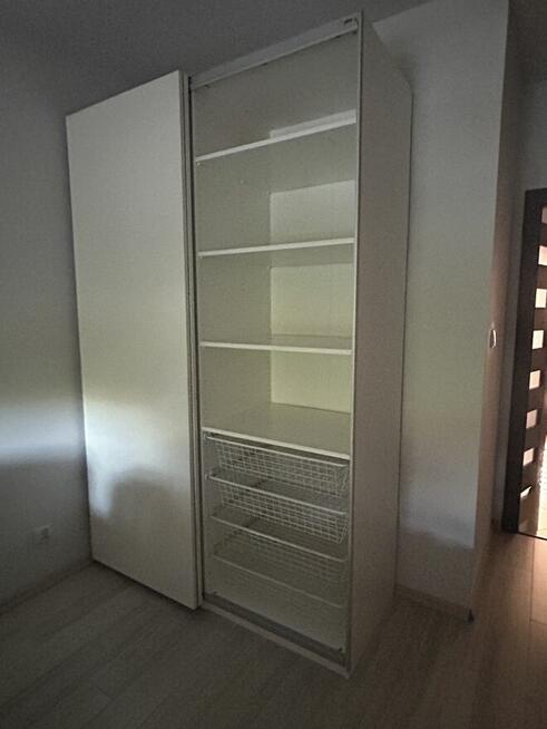 Biała przesuwna szafa Po 1 stronie 2 drążki, po drugiej polki i wysuwane kosze W bardzo dobry stanie Do samodzielnego ...