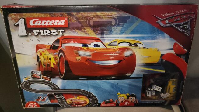 Sprzedam używany tor wyścigowy Carrera FIRST Disney Cars 3. Dzieci sterują autkami za pomocą kontrolerów prędkości. ...