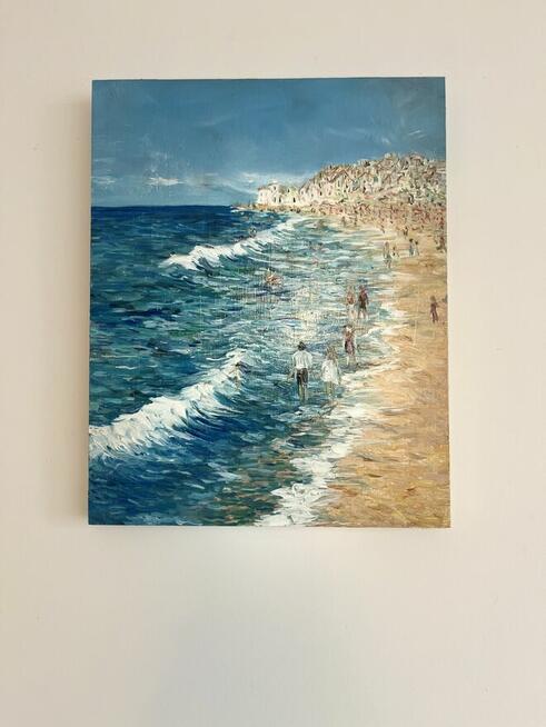 Oryginalny obraz olejny przedstawiający nadmorski krajobraz z plażą i spacerującymi ludźmi. Praca wykonana ręcznie ...