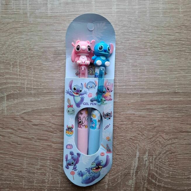 Uroczy zestaw dwóch klasycznych długopisów w kolorze niebieskim (Stitch) i różowym (Angel), z figurkami popularnych ...