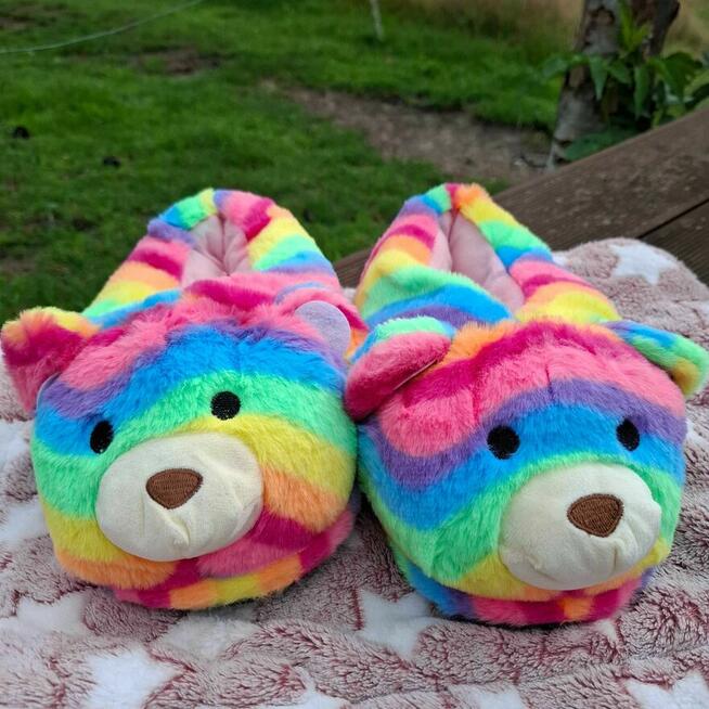 Przeurocze, miękkie kapcie w kształcie misia w tęczowych barwach – idealne, by dodać odrobinę koloru i radości do ...