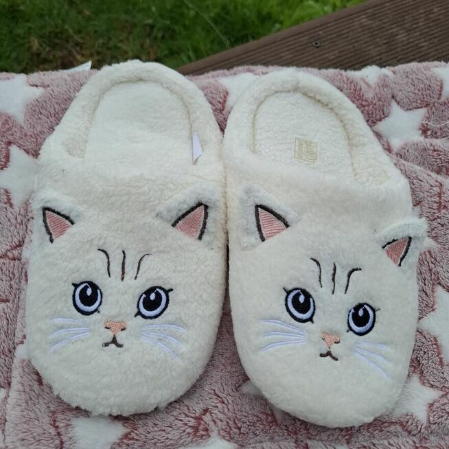 Kto powiedział, że komfort nie może mieć kociego charakteru? Sprzedam śliczne, białe kapcie z motywem kota – idealne ...