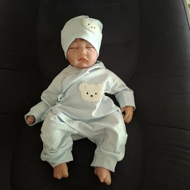 Sprzedam uroczy komplet dla maluszka – czapeczka i pajacyk w kolorze jasnoniebieskim z przesłodkim nadrukiem misia . ...