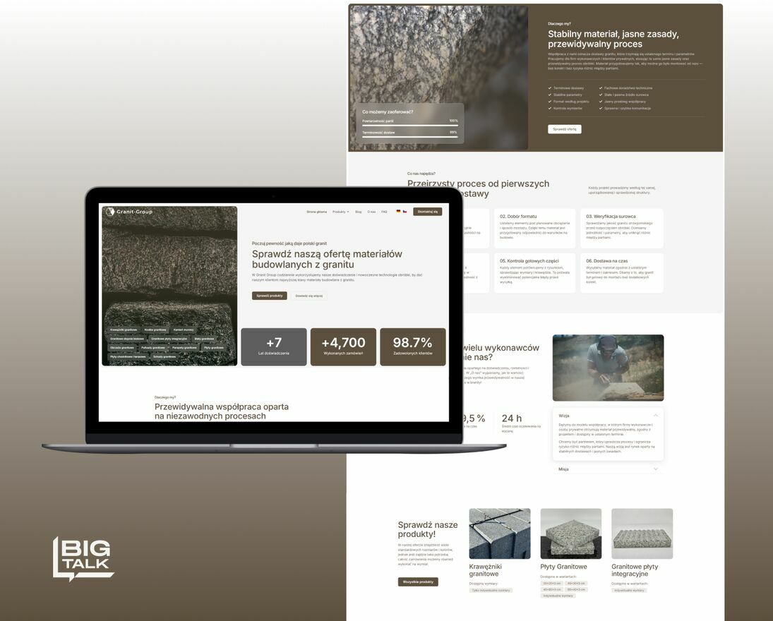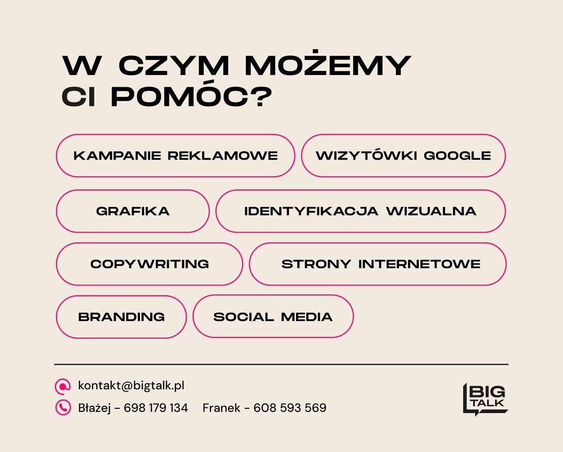 BigTalk to agencja marketingowa z Poznania, działająca na os. Pod Lipami 8A (Winogrady). Projektujemy i wdrażamy strony internetowe dla firm z Poznania i całej Polski. Tworzymy strony internetowe, które porządkują ofertę, opisują zakres usług i wspierają klientów w podejmowaniu decyzji. Uzupełniamy je działaniami mającymi sens biznesowy: wizytówką Google, kampaniami Google Ads i Meta Ads, podstawowym SEO oraz projektami graficznymi. Sprawdź, jak możemy Ci pomóc!Galeria zdjęć: