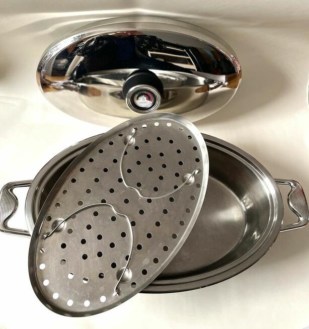 Owalna brytfanna ze stali nierdzewnej Zepter z pokrywą z termokontrolerem oraz wkładem do gotowania na parze. Idealna do ...